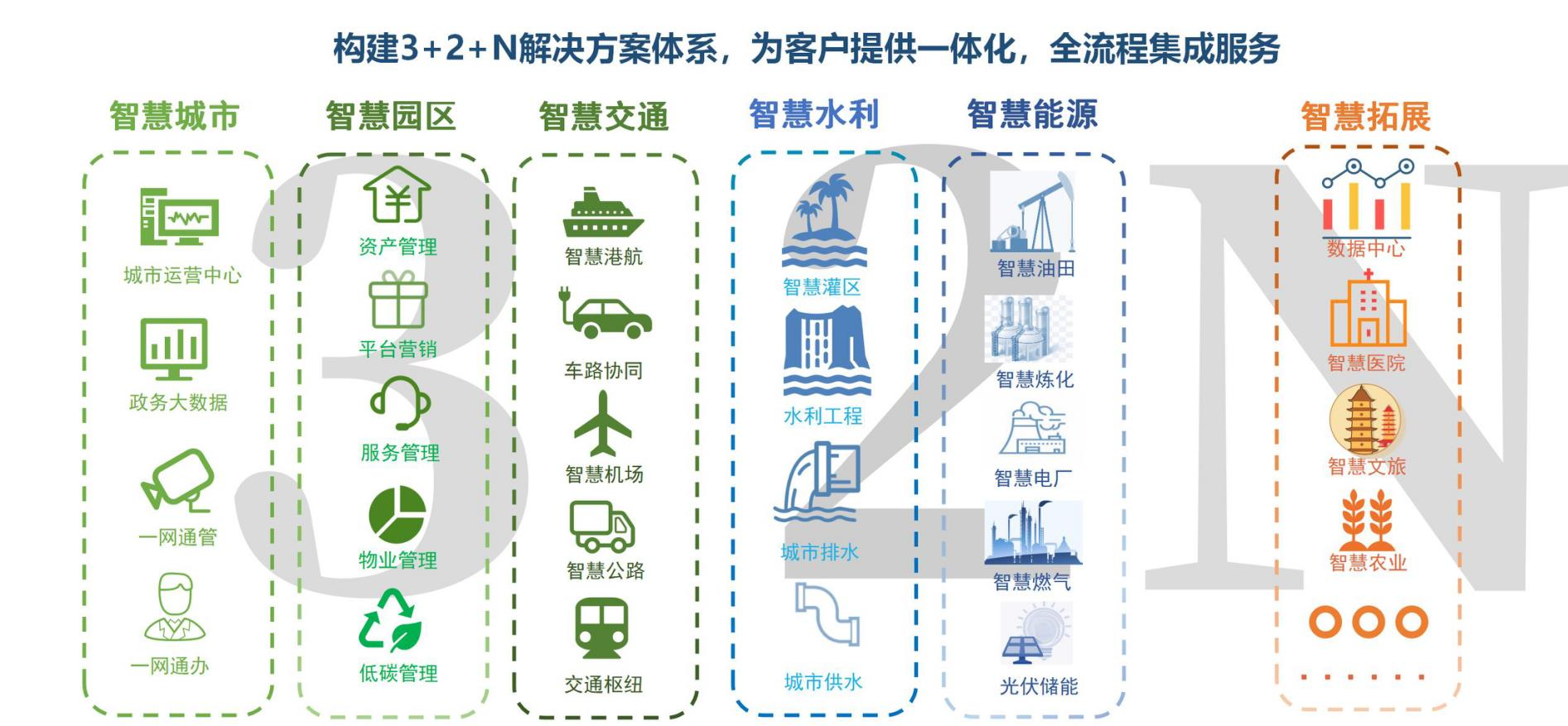 亨通智慧智慧城市建設構建3+2+N方案體系,為客戶提供一體化、全流程集成服務。通過采用物聯網、云計算等技術,建設一個統一的平臺、一套移動終端整合社區資源,促進城市服務管理等方面的信息化應用,實現對城市、園區、交通、水利、能源等多種元素進行綜合的智能化管理。